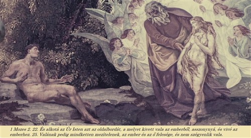 I. Mózes 2.22. És alkotá az Úr Isten azt az oldalbordát, a melyet kivett vala az emberből, asszonnyá, és vivé az emberhez. 23. És monda az ember: Ez már csontomból való csont, és testemből való test: ez asszonyembernek neveztessék, 25. Valának pedig mindketten mezítelenek, az ember és az ő felesége, és nem szégyenlik vala.